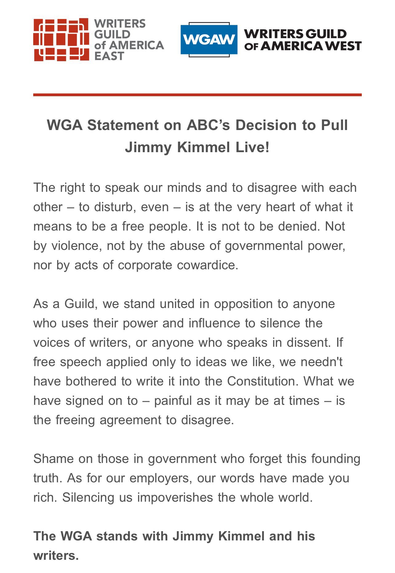 The WGA and SAG-AFTRA organizations issues responses regarding the news below.